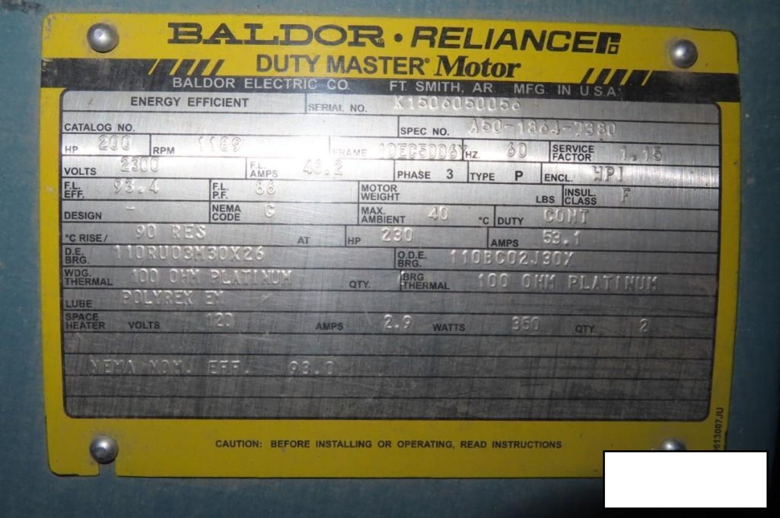 Baldor motor, 200 hp, 1189 RPM, 10EC5006Y frame, s/n K156050056