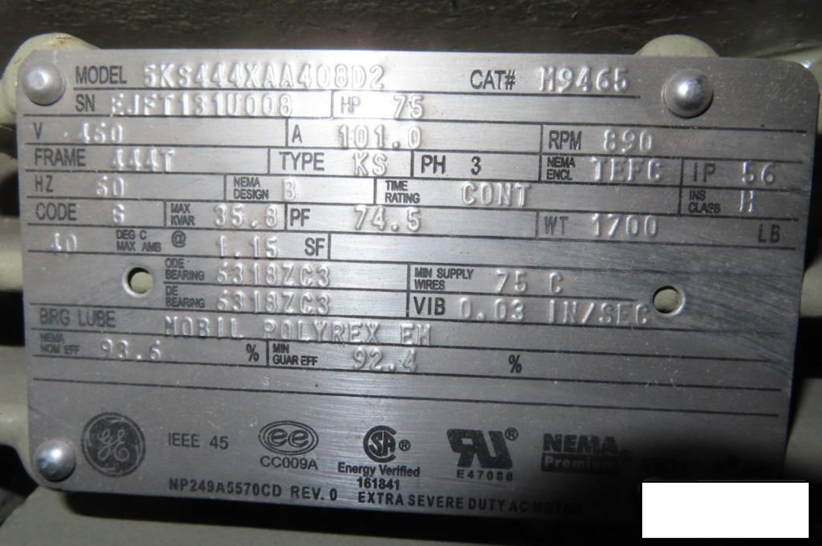 General Electric 5KS444XAA40802 motor, 75 hp, 890 RM, 444T frame, s/n FJFT131U008