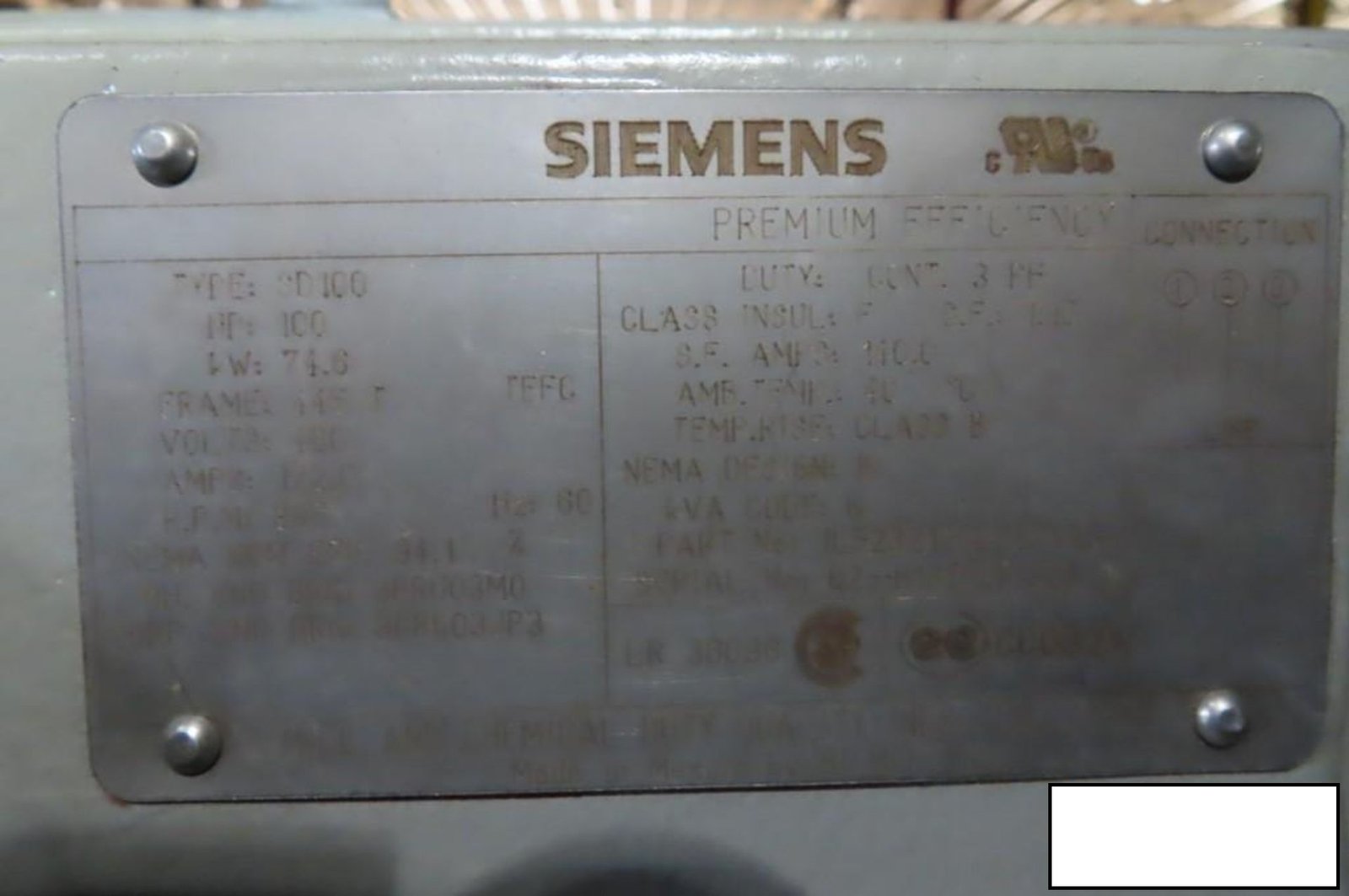Siemens SD100 motor, 100 hp, 885 RPM, 445T frame, s/n Q2-H13TE3P.826